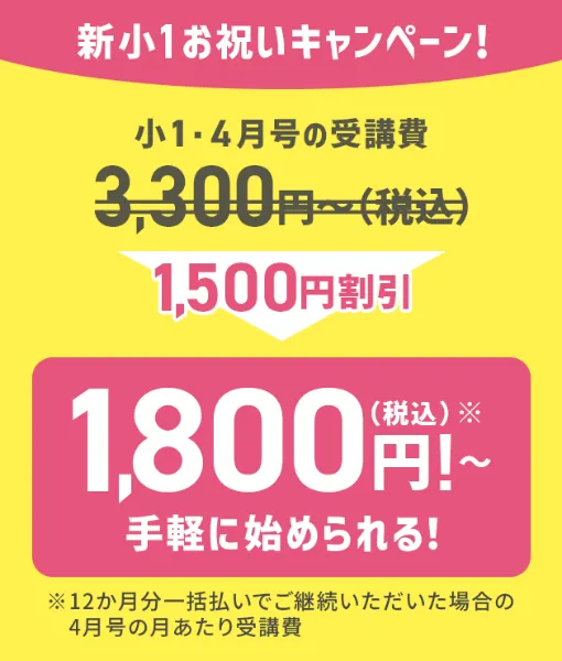 「新小1お祝いキャンペーン」により、初月(4月号)の受講費が1,500円割引になります。