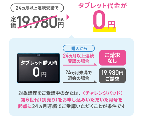 24か月以上続けて受講することで、〈チャレンジパッド 第6世代〉の代金が無料になる制度があります。