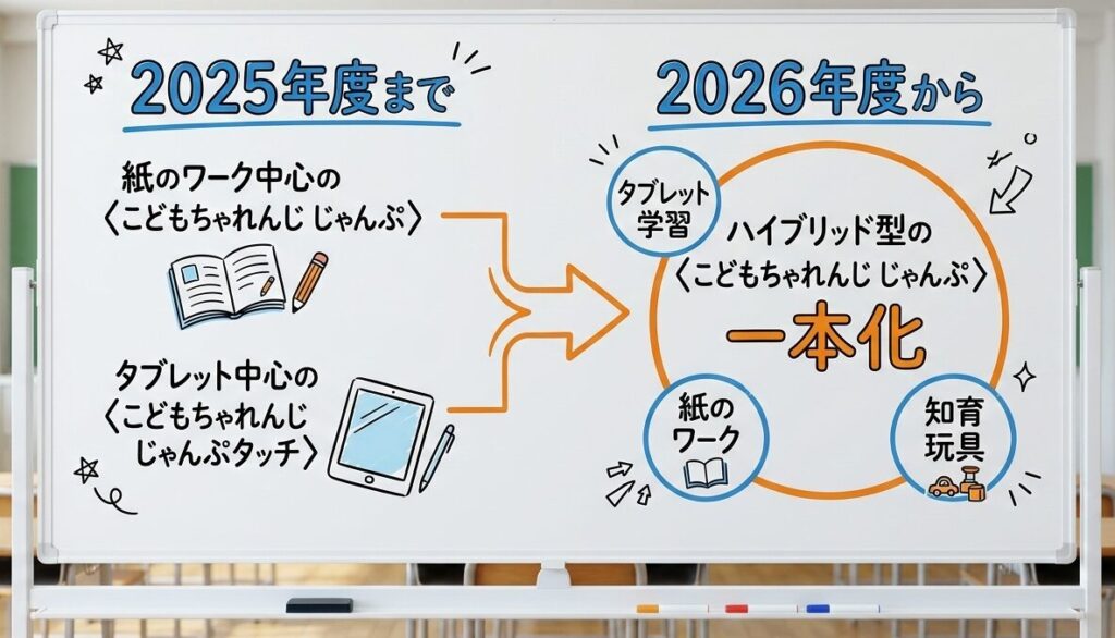 これまで「紙のワーク中心〈じゃんぷ〉」と「タブレット中心〈じゃんぷタッチ〉」の2つに分かれていたコースが、2026年度からは『こどもちゃれんじ じゃんぷ』という一つのスタイルに一本化されます。
