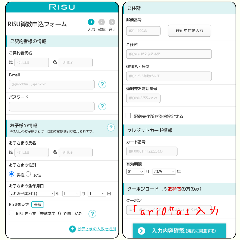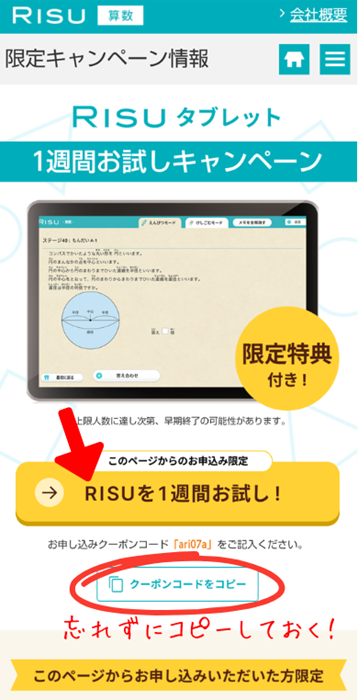 現在、RISU算数ではこちらのキャンペーン専用ページからクーポンコードari07aを入力して申し込むことで、1週間お試し体験が可能です。(1週間で返品の場合に限り、教材の送料+保険料の1,980円がかかりますが、継続すれば無料です。)