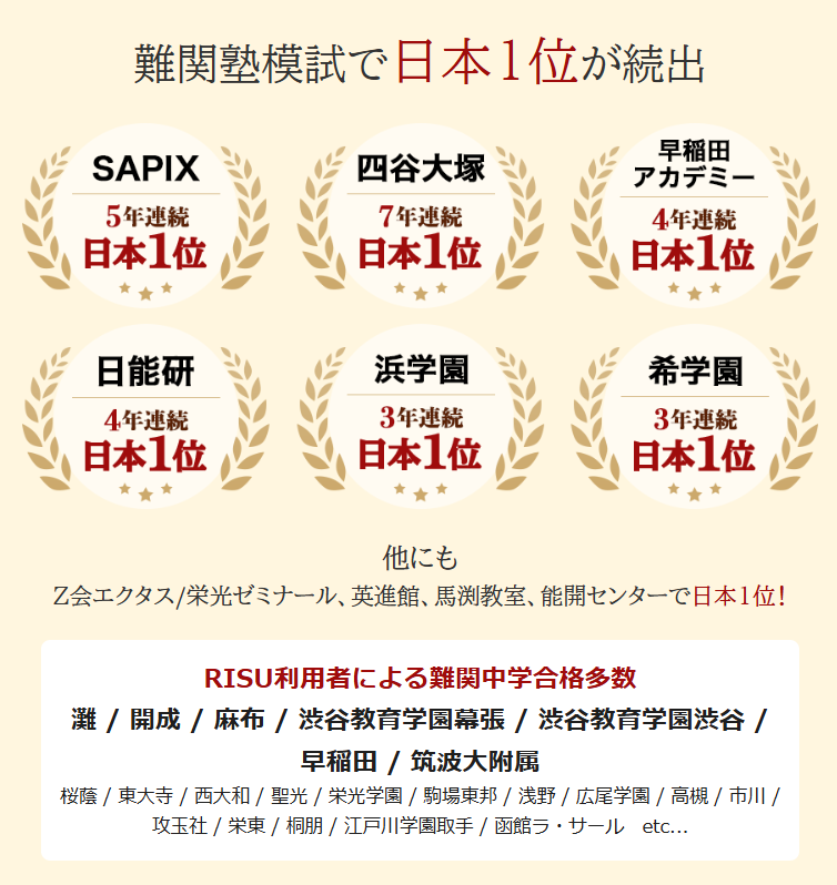 「全国模試1位」「開成/麻布/渋谷教育学園渋谷 中学合格」など、華々しい実績が続々と出てきているRISU算数。