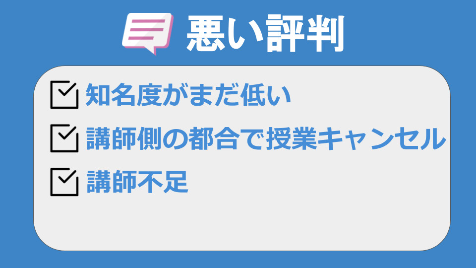 講師側の都合で授業がキャンセルになったという口コミがありました。